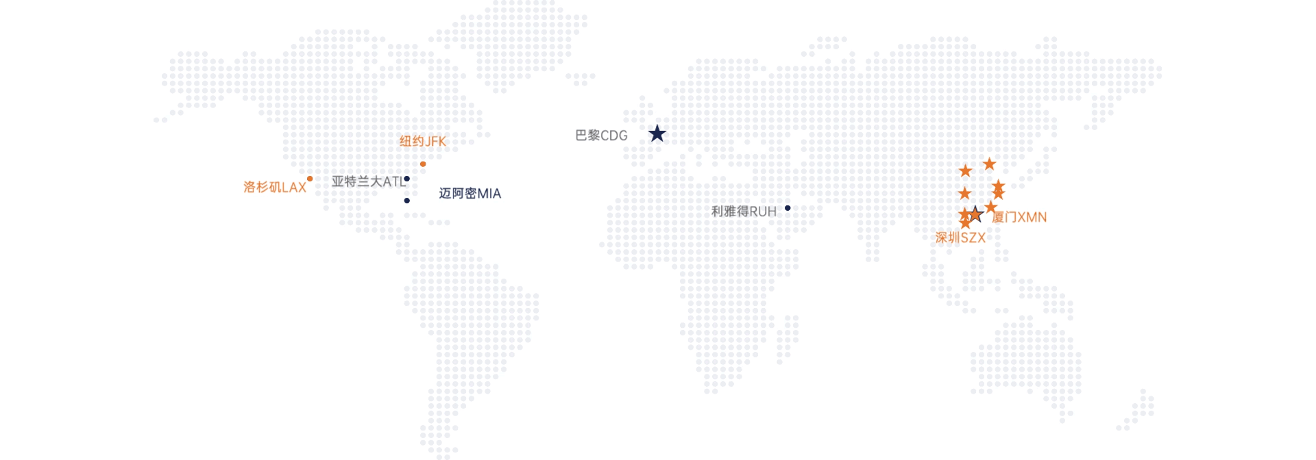 整合豐富的艙位資源和自主運力,提供輻射亞洲及歐、美主要城市的腹艙空運及全貨機空運服務,支持高貨值商品、供應鏈產品、生鮮進出口,為客戶提供更快捷高效的 運輸保障。目前在運營深圳-戴高樂航線提供一周六班雙向運力。